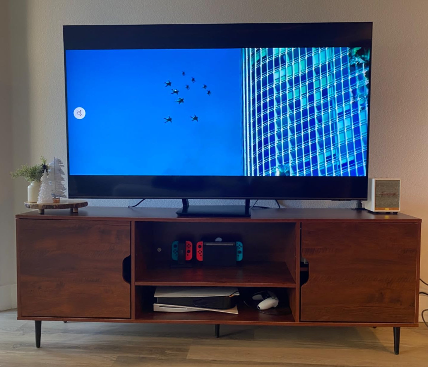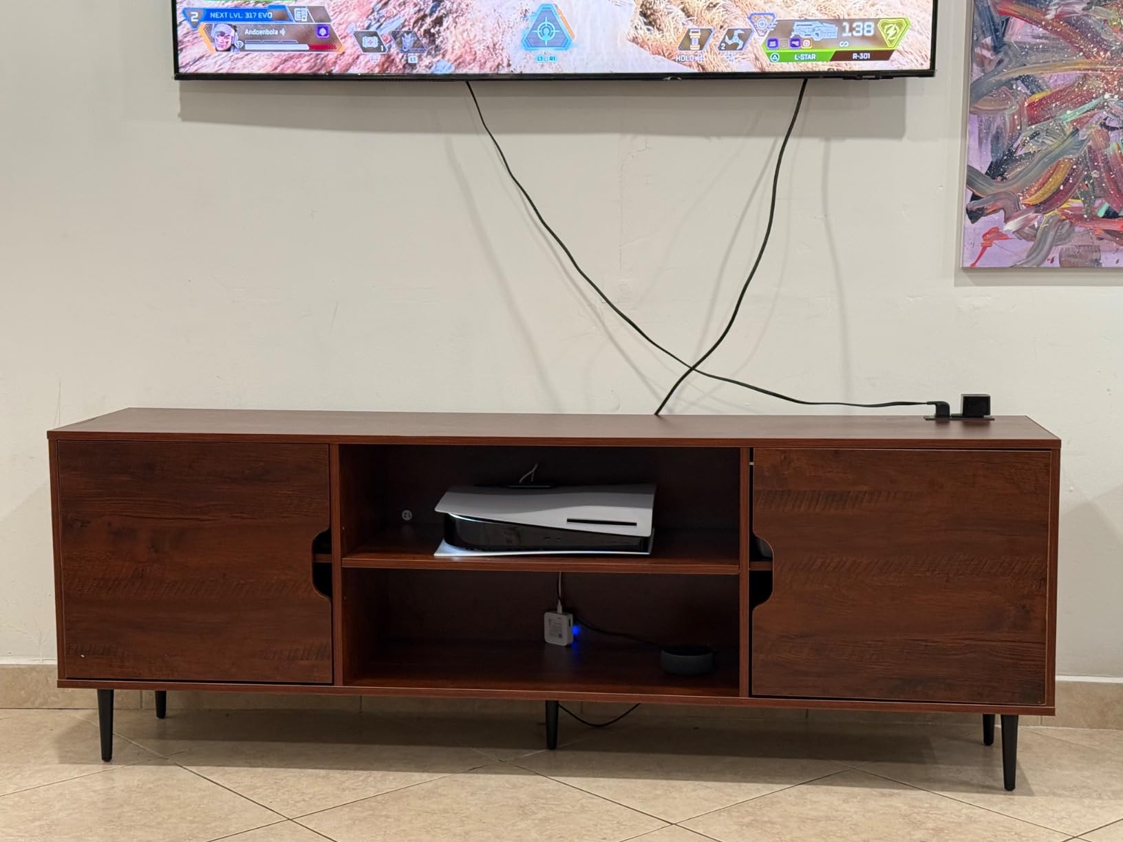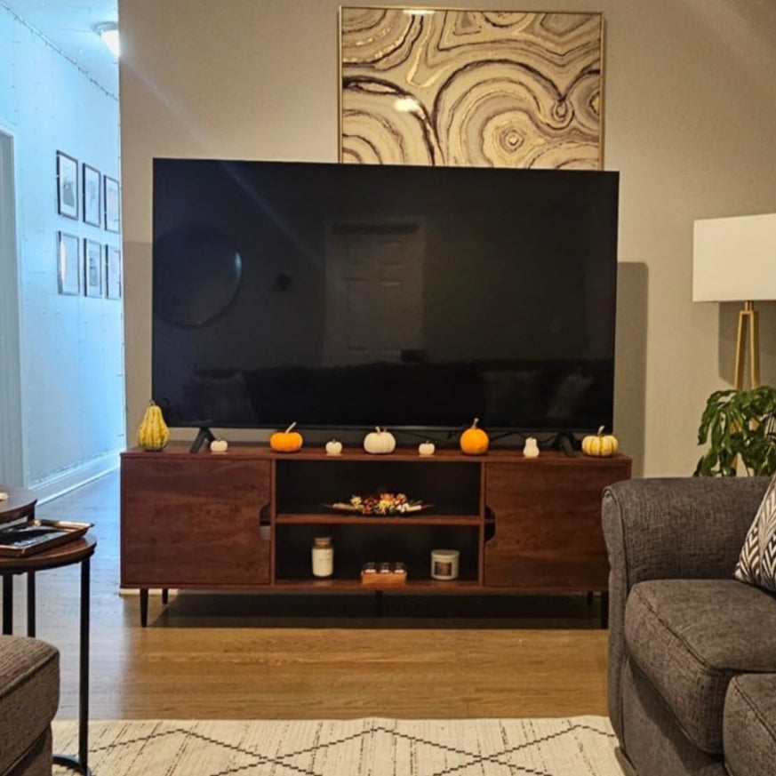 Kata loves this Modern Mid-Century media cabinet. With open and closed compartments, it keeps everything organized while elevating any space. The built-in extension cord is a game-changer for cable management.