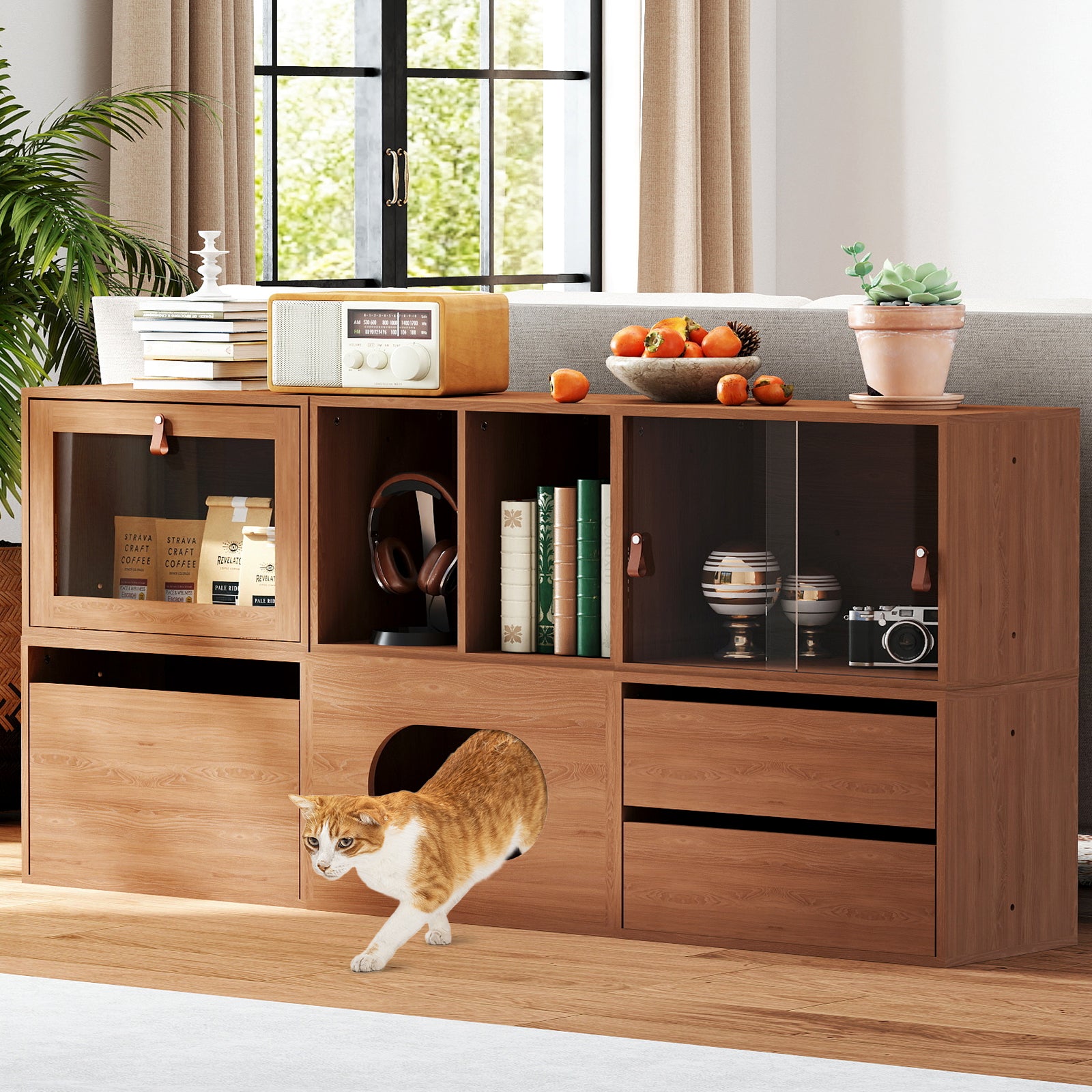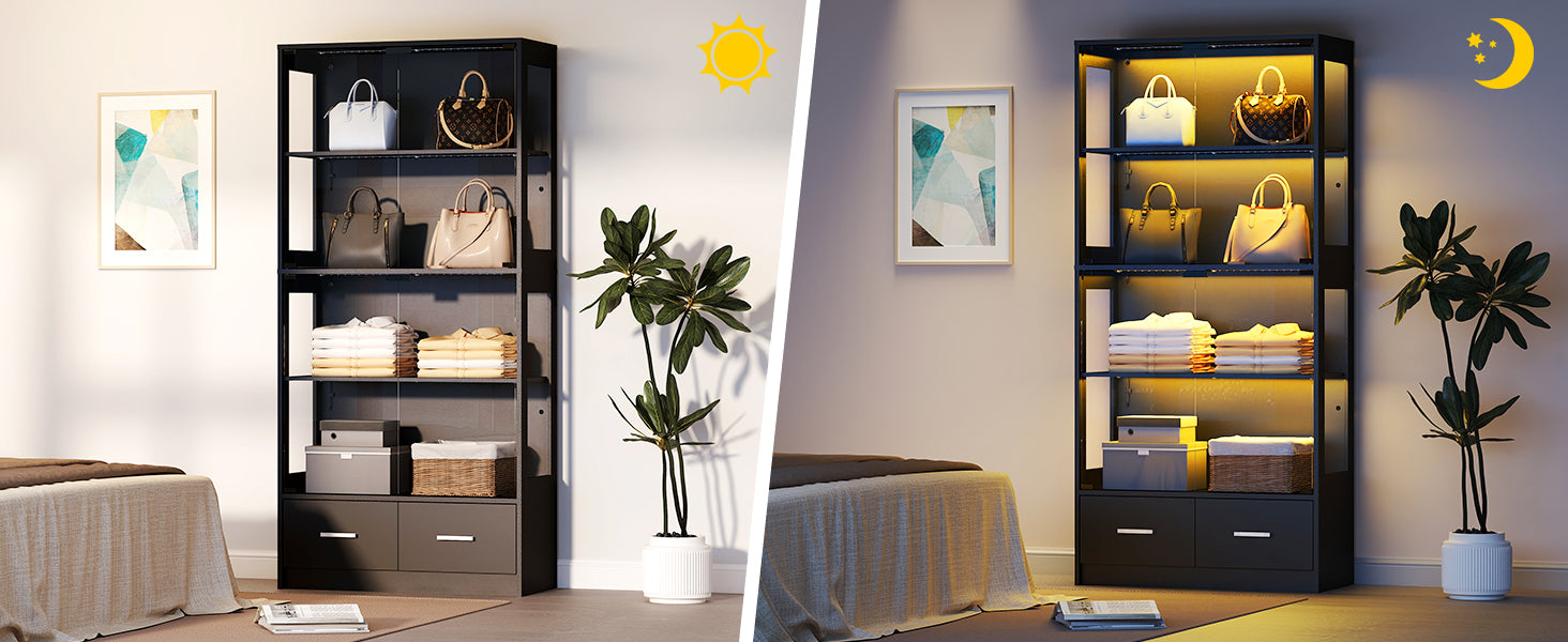 A 4-tier display with two hidden drawers keeps your space neat, combining style with functionality.